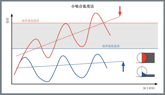 從熱負荷角度來(lái)看,如果嚙合弧小,切削時(shí)間可能不足以產(chǎn)生最大刀具壽命所需的最低溫度。由于增加切削速度通常會(huì )產(chǎn)生更多的熱量,將小嚙合弧與更高的切削速度相結合有助于將切削溫度提升至所需的水平。更高的切削速度還會(huì )縮短切削刃與切屑接觸的時(shí)間,從而減少傳入刀具的熱量??傮w而言,更高的切削速度還會(huì )減少加工時(shí)間并提高生產(chǎn)率。另一方面,更低的切削速度會(huì )降低加工溫度。如果加工中產(chǎn)生的熱量過(guò)多,降低切削速度可將溫度降至可接受的水平。